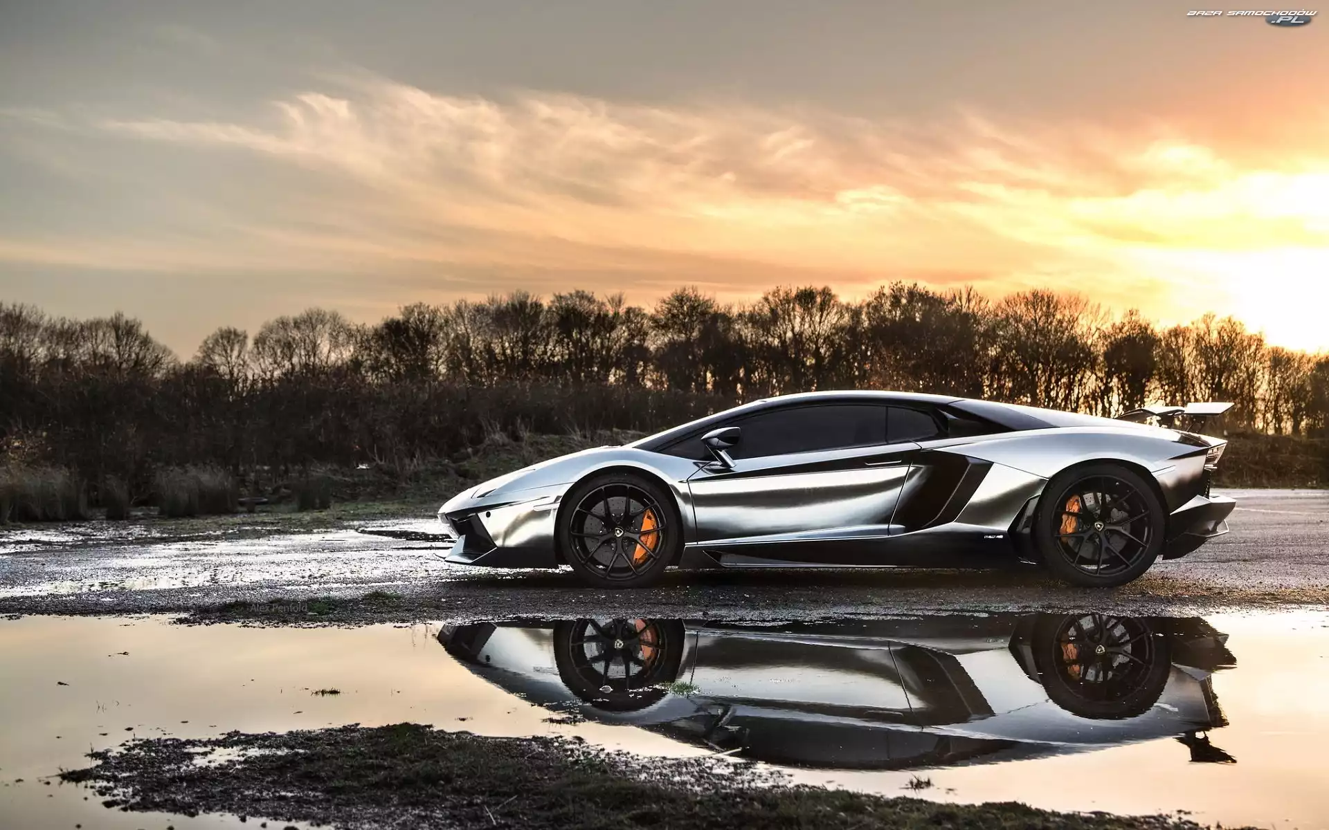 Odbicie, Kałuża, Droga, Lamborghini Adventador, Drzewa- Zdjęcia samochodów